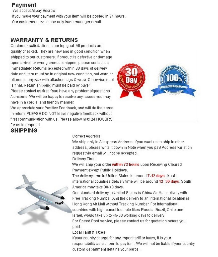 | Return Policy | If the product you receive is not as described or low quality, the seller promises that you may return it before order completion (when you click "Confirm Order Received" or exceed confirmation timeframe) and receive a full refund. The return shipping fee will be paid by you. Or, you can choose to keep the product and agree the refund amount directly with the seller. N.B.: If the seller provides the "Longer Protection" service on this product, you may ask for refund up to 15 days after order completion. |