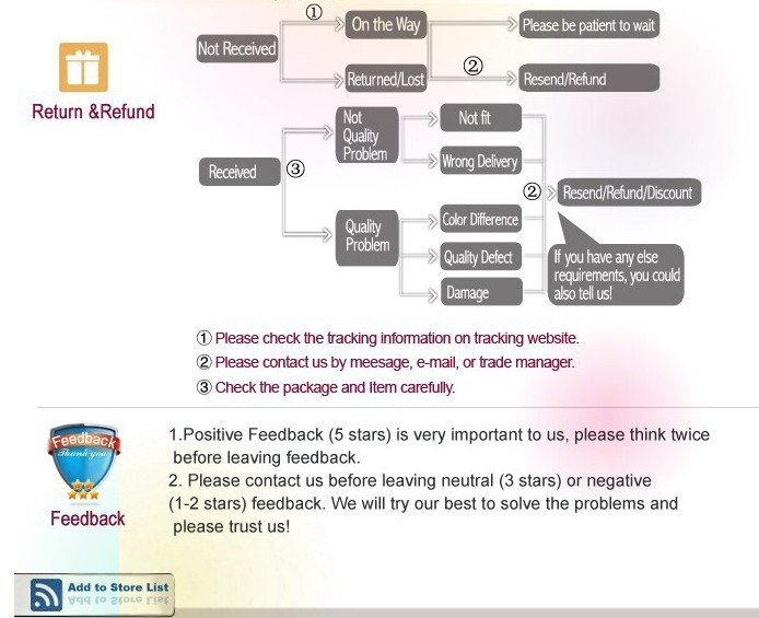 Return PolicyIf the product you receive is not as described or low quality, the seller promises that you may return it before order completion (when you click "Confirm Order Received" or exceed confirmation timeframe) and receive a full refund. The return shipping fee will be paid by you. Or, you can choose to keep the product and agree the refund amount directly with the seller.