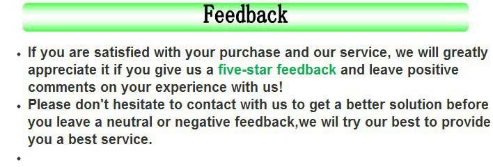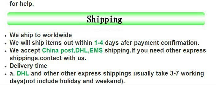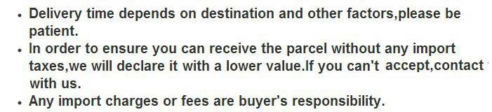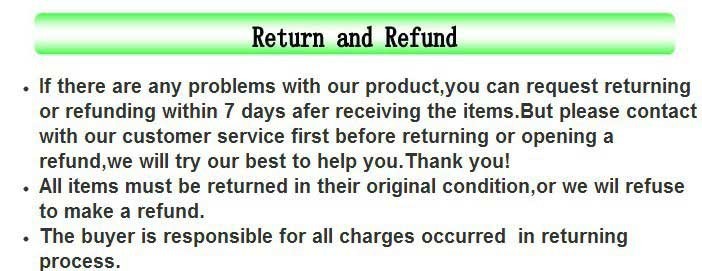 Return PolicyIf the product you receive is not as described or low quality, the seller promises that you may return it before order completion (when you click "Confirm Order Received" or exceed confirmation timeframe) and receive a full refund. The return shipping fee will be paid by you. Or, you can choose to keep the product and agree the refund amount directly with the seller.
