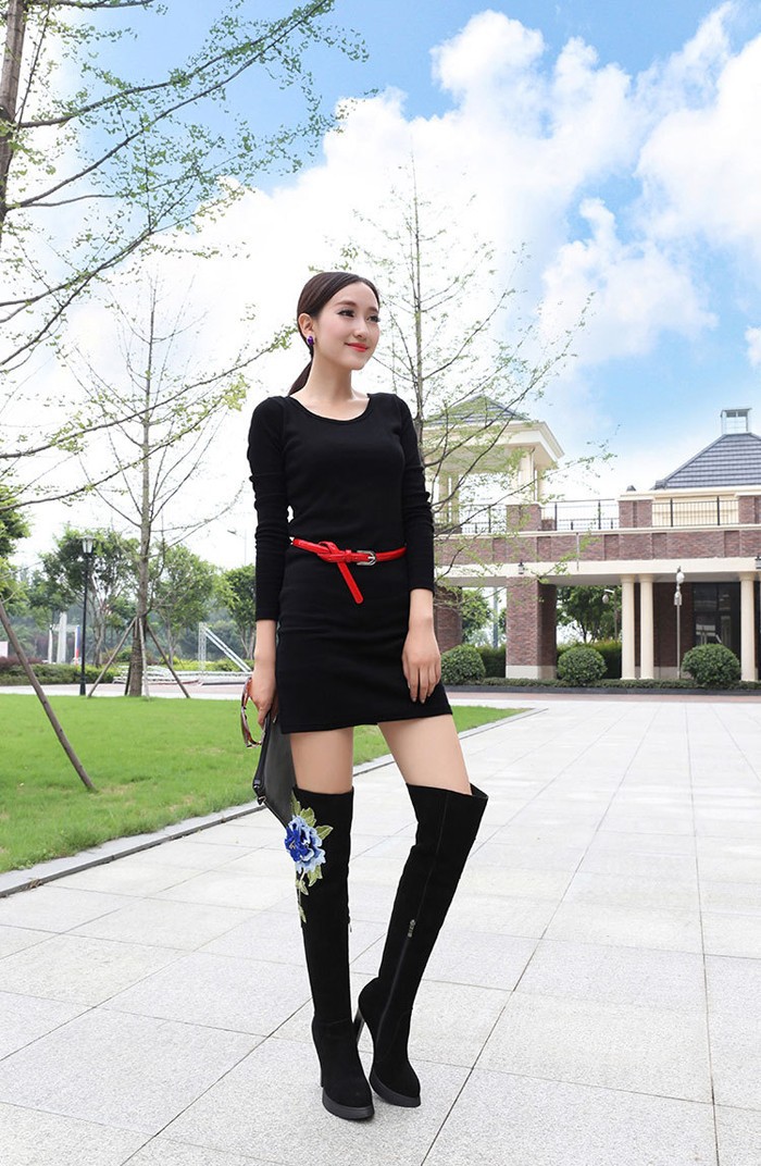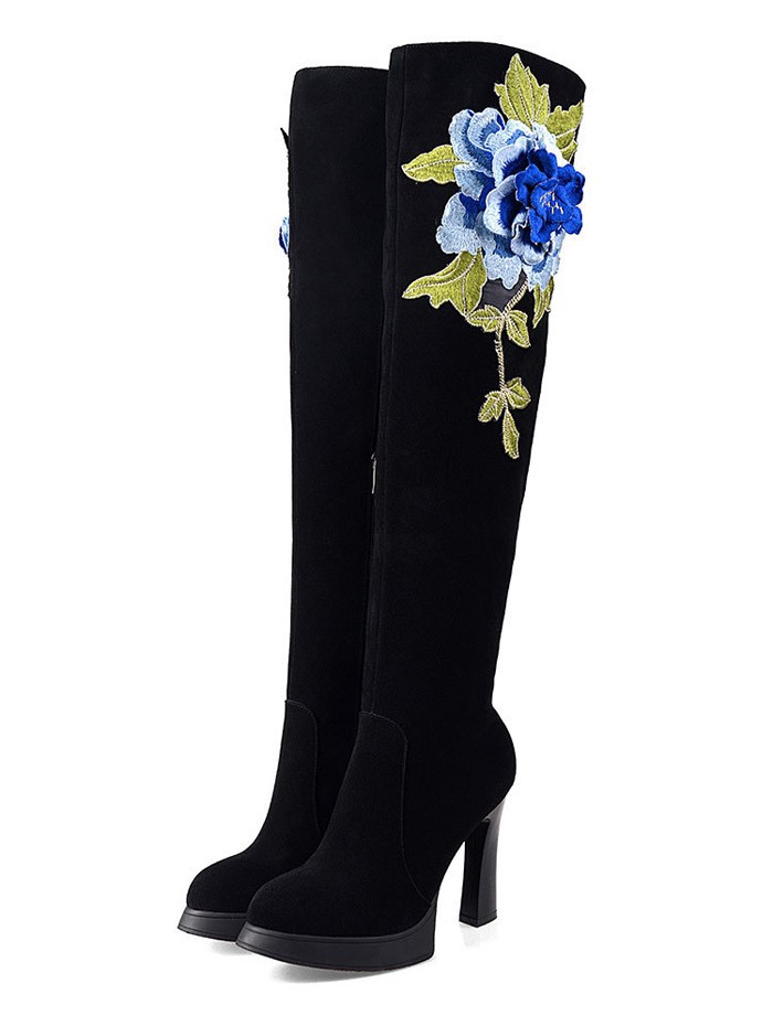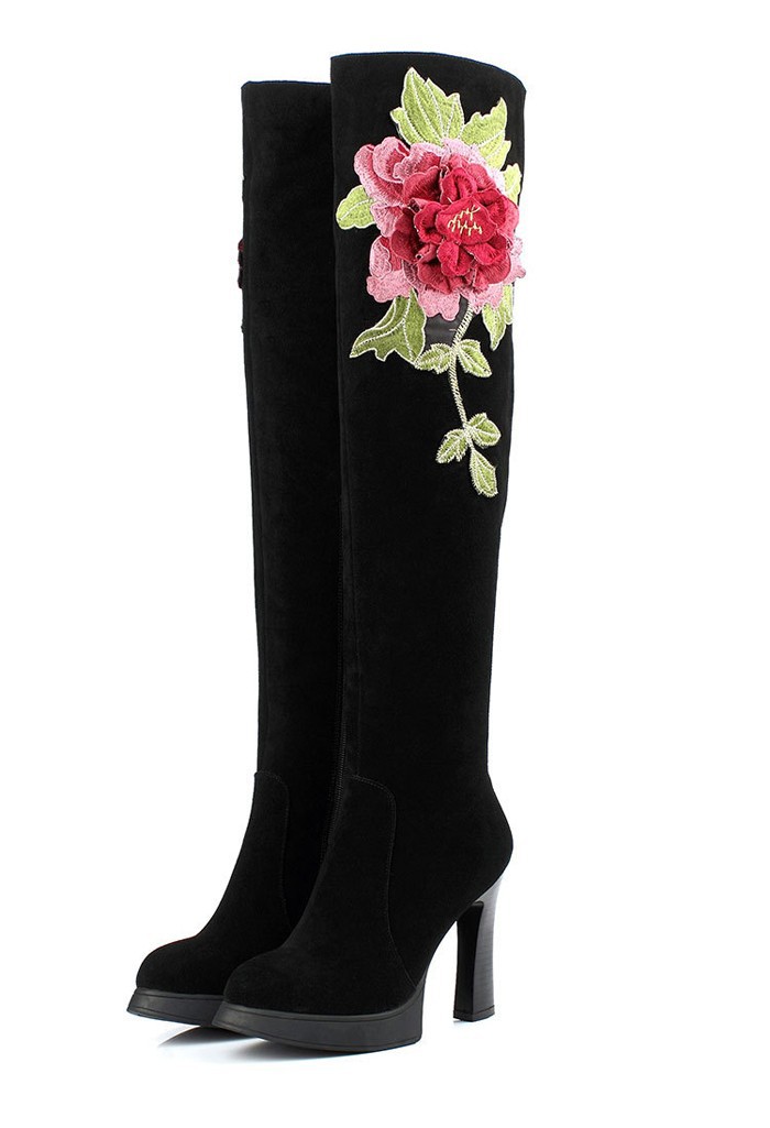 2014 Europe And America Fashion Over the Knee Boots Solid Nubuck Leather Stereoscopic Embroidery Flower Womens
