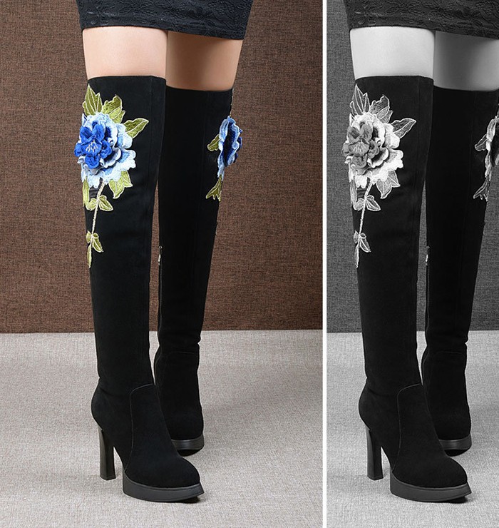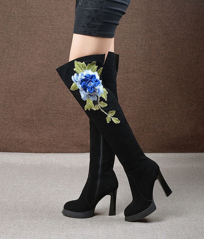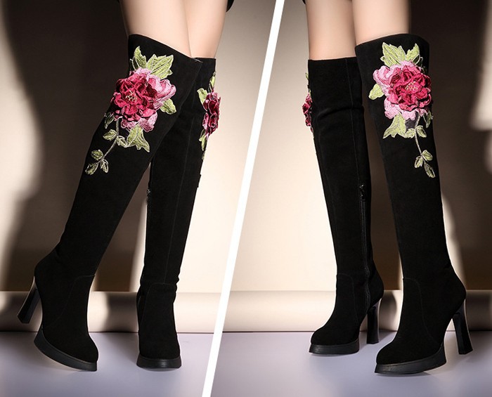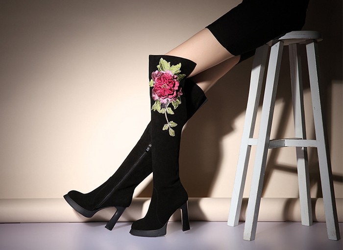 2014 Europe And America Fashion Over-the-Knee Boots,Solid Nubuck Leather Stereoscopic Embroidery Flower Womens Shoes Pumps