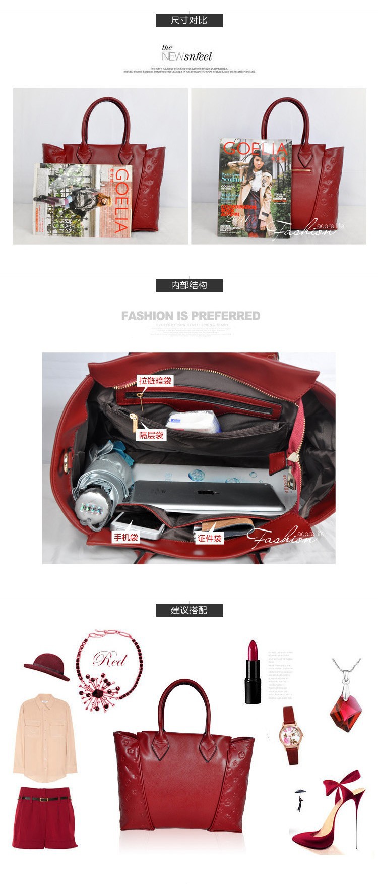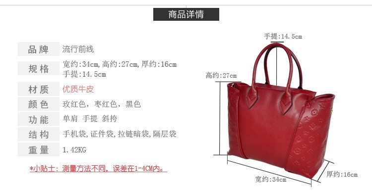 Specification: width: 34cm, height of about: 27cm, thickness: 16cm, hand: 14.5cm Material: high quality leather Function: shoulder, diagonal, portable Structure: cell phone bags, document bags, zipper pocket, compartment bags Weight: 1.42KG Tips: different measurement methods, the error is 1-4cm within