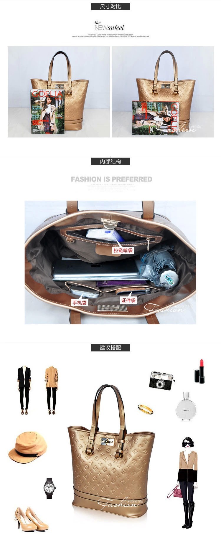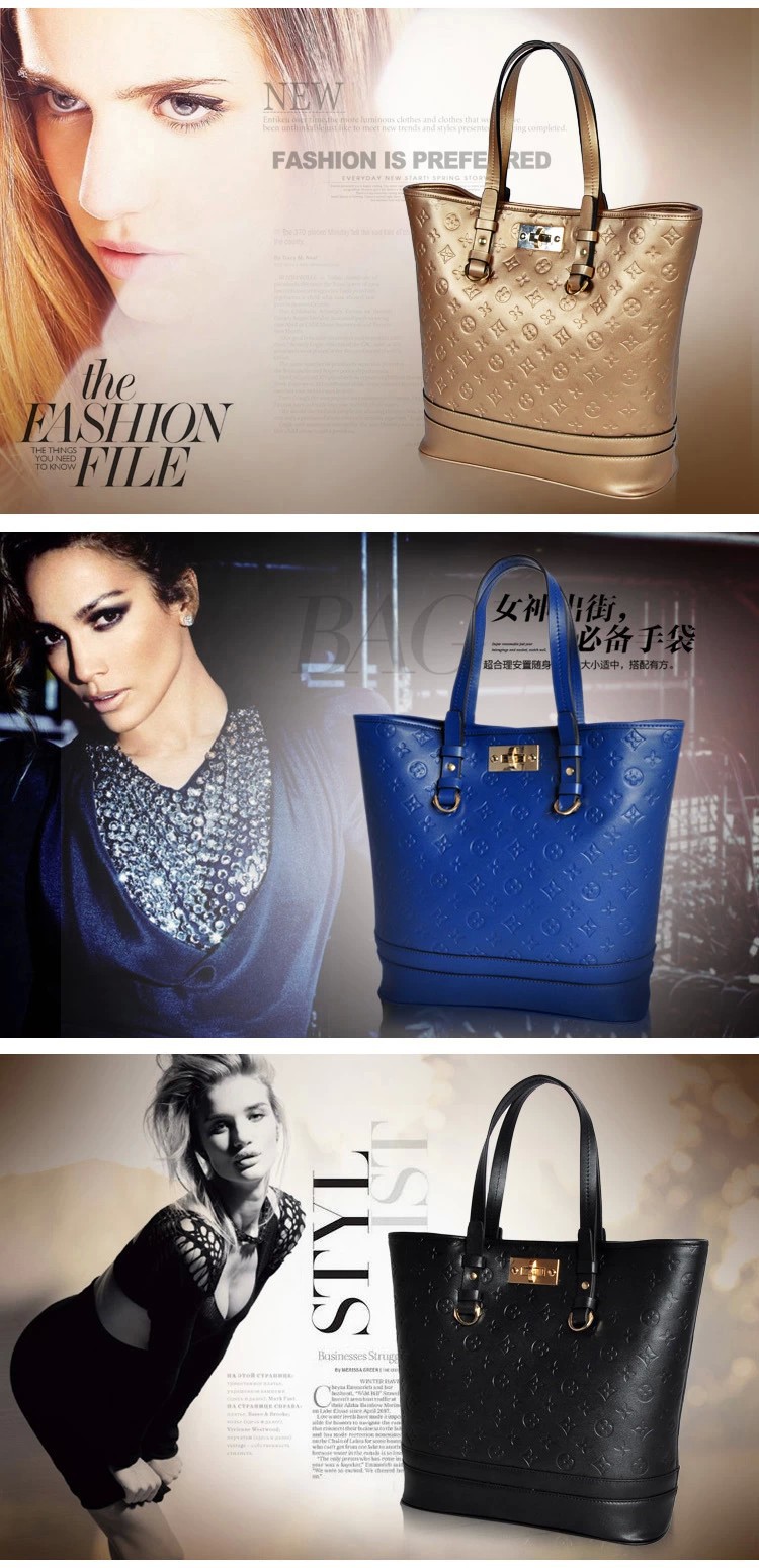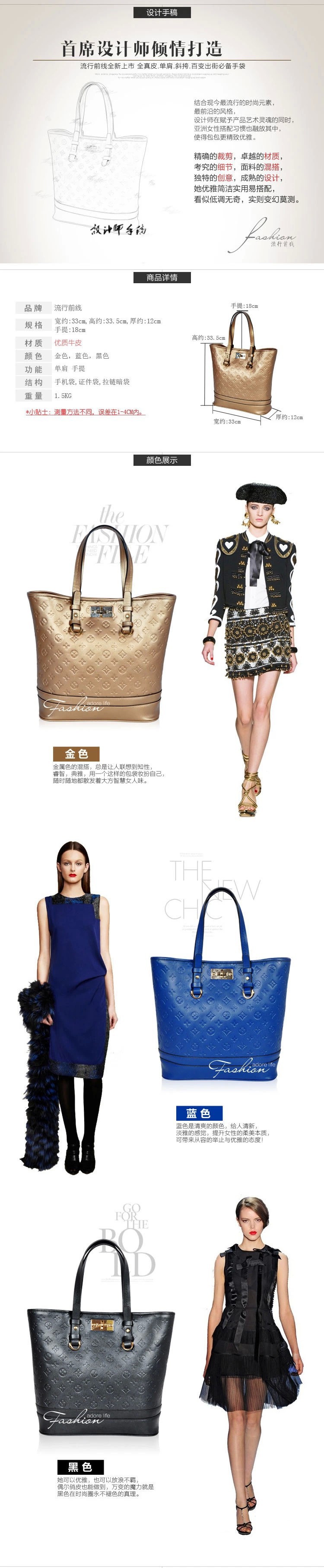Material: Leather Cortical features: cow split leather Processing methods: soft surface Style: European and American style Style: handbag, shoulder bag Luggage shape: square section vertical Strap root number: double root Openings way: Magnetic Hardness: Soft Popular elements: Embossing Pattern: solid Package internal structure: cell phone pocket Lining Material: Polyester Ask carry parts: the soft Outer bag types: three-dimensional bags Bag Size: Large Color: blue, black, bronze Specification: width: 33cm, height of about: 33.5cm, thickness: 13cm, hand: 18cm Material: high quality leather Function: shoulder, diagonal Structure: cell phone bags, document bags, zipper pocket Weight: 1.5KG Tips: different measurement methods, the error is 1-4cm within