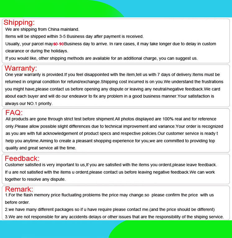 | Seller Service | On-time DeliveryIf you do not receive your purchase within 60 days, you can ask for a full refund before order completion (when you click "Confirm Order Received" or exceed confirmation timeframe). |