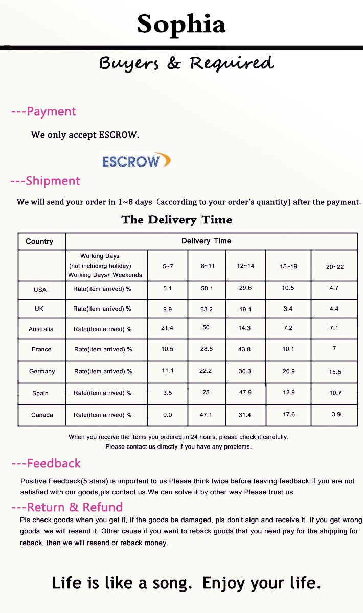 | Seller Service | On-time DeliveryIf you do not receive your purchase within 60 days, you can ask for a full refund before order completion (when you click "Confirm Order Received" or exceed confirmation timeframe). |