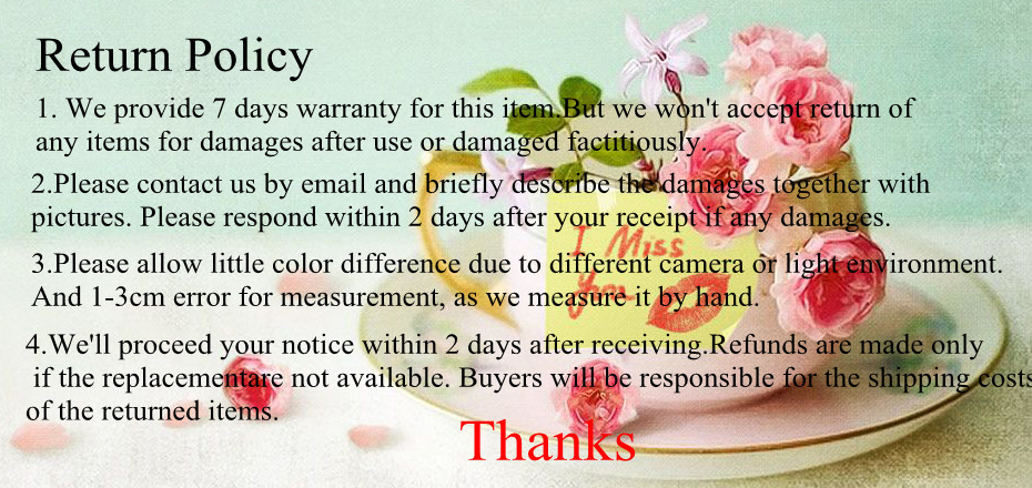 - Please write down the size, color or others items in the comment or send them to us by mail ,when you place the order. All emails will be answered within 1 business day. If you do not receive our reply , please kindly re-sent your email and we will reply to you as soon as possible.