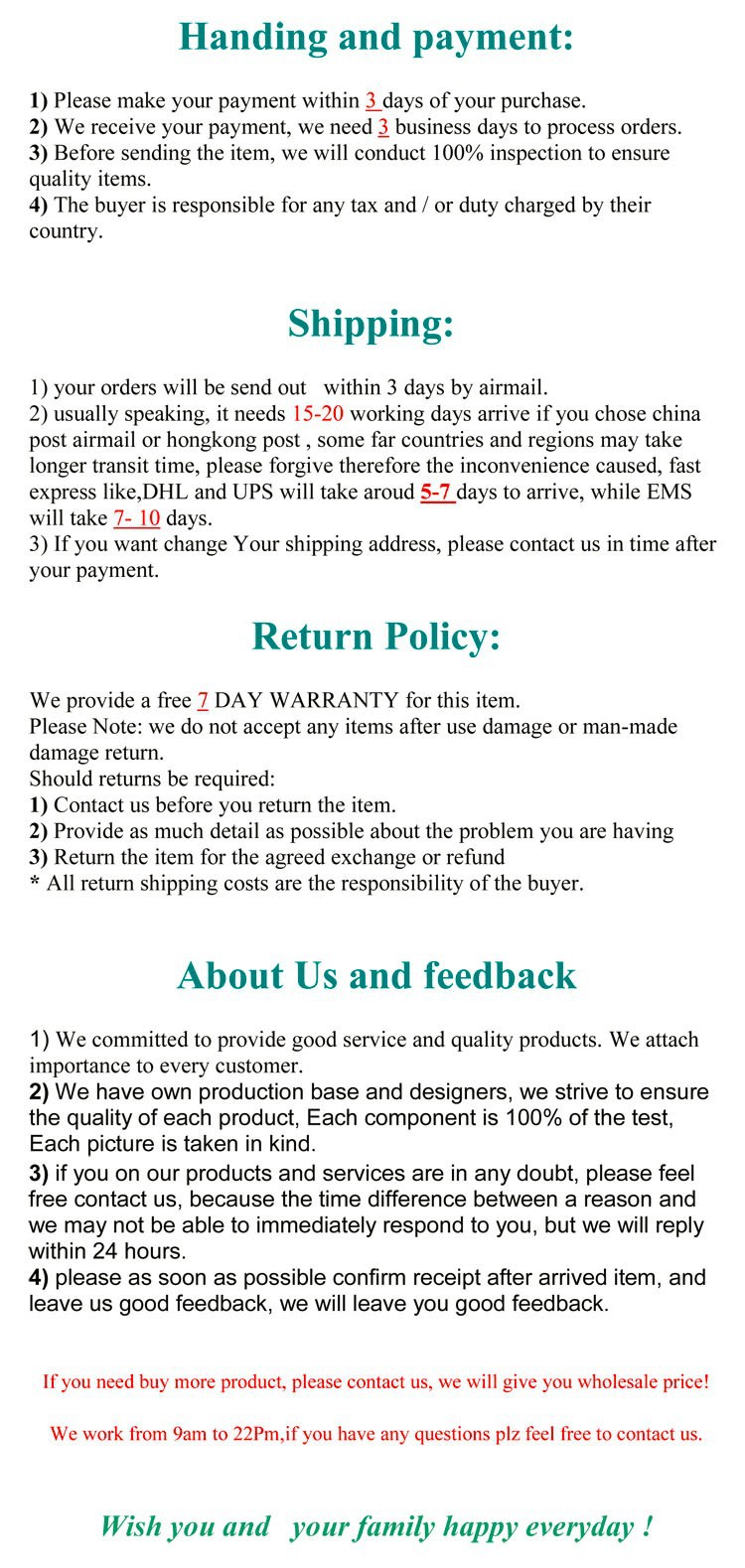 Return PolicyIf the product you receive is not as described or low quality, the seller promises that you may return it before order completion (when you click "Confirm Order Received" or exceed confirmation timeframe) and receive a full refund. The return shipping fee will be paid by you. Or, you can choose to keep the product and agree the refund amount directly with the seller.