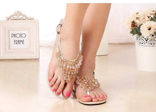 2014 korean bohemian lady fashion beading sandal flat heel flip flops women summer comfort shoe large
