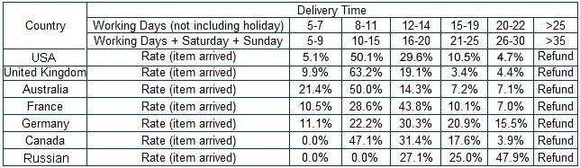 | Seller Service | On-time DeliveryIf you do not receive your purchase within 60 days, you can ask for a full refund before order completion (when you click "Confirm Order Received" or exceed confirmation timeframe). |