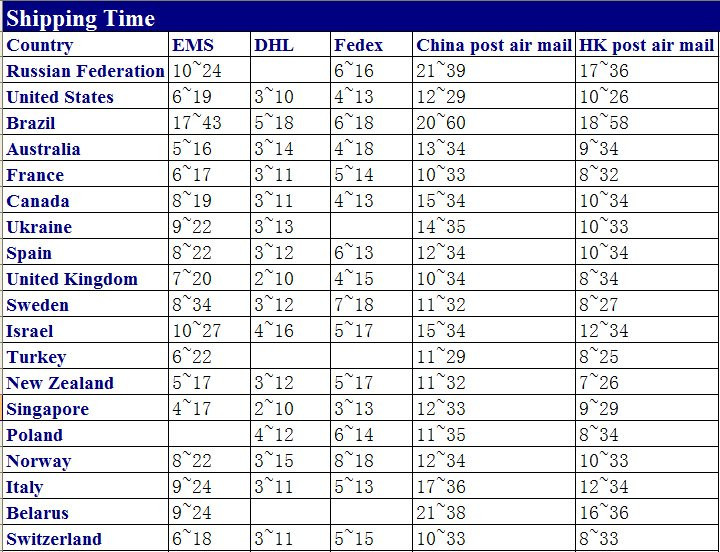 | Post Air Mail | Free Shipping | 15 - 45 days |