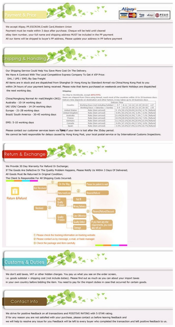 Return Policy | If the product you receive is not as described or low quality, the seller promises that you may return it before order completion (when you click "Confirm Order Received" or exceed confirmation timeframe) and receive a full refund. The return shipping fee will be paid by you. Or, you can choose to keep the product and agree the refund amount directly with the seller. N.B.: If the seller provides the "Longer Protection" service on this product, you may ask for refund up to 15 days after order completion. |