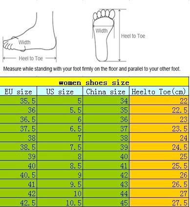 Dear buyer,please notice these colors and sizes info when you place an order.If you have any questions, please contact us by e-mail or Trade Manager,we will reply in the first time.Thanks!Note:please according your foot lenght reference size chart choose fit size. If your foot is fat or wide, advised to choose a bigger size for more comfortable.Check your size now!!Size:35/36/37/38/39
