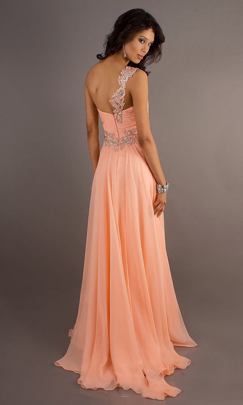 2014 New Fashion Summer Beading Applique Side Slit A Line Bodice One Shoulder Peach Prom Dress Evening Dress Gown Vestidos