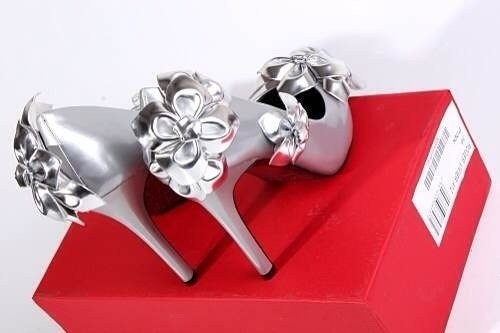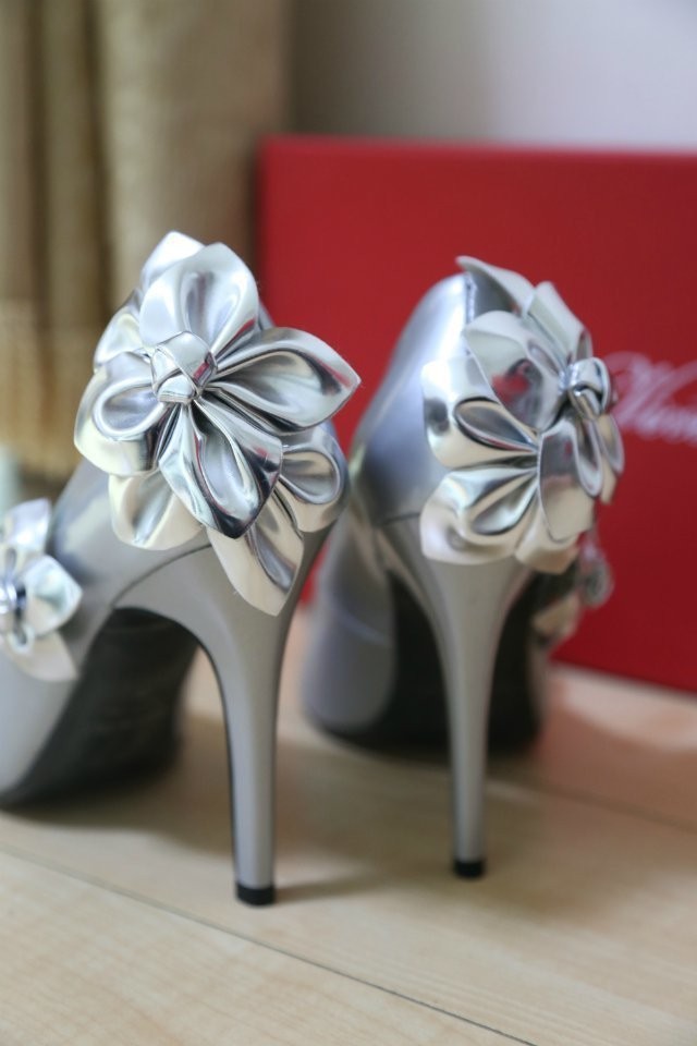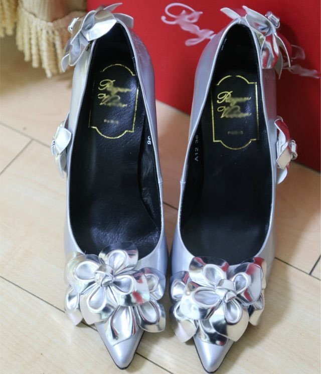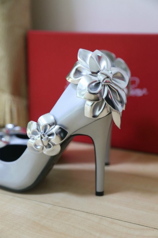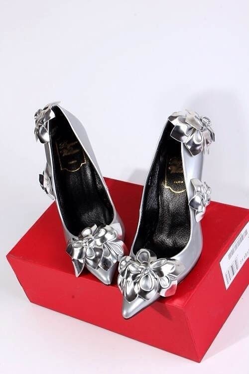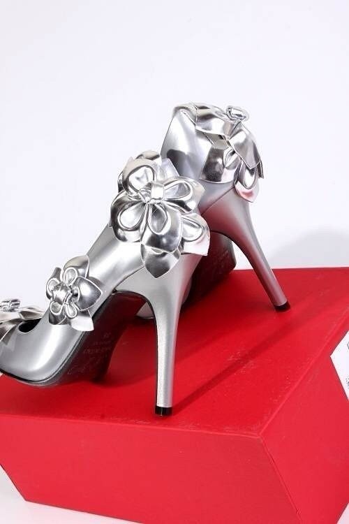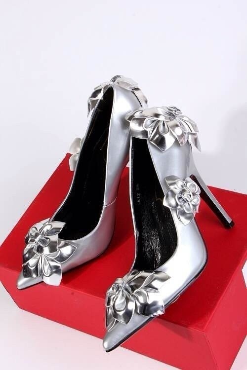 Hihg Quality Geniune Leather Women Pumps Floral design Silver Thin Heels High Heels Lady Pointed Closed Toe Basic Party Shoes