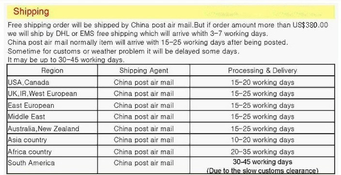 4.Delivery time depends on destination and other factors (Customs,Chinese post office,your country’s post office&natural calamities),if you can’t get your order in time