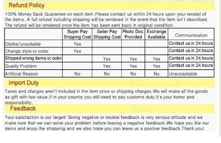 2. If you are not satisfied when you receive your item, please return it within 7 days with the intact packaging for a replacement or money-back. Please contact me before you return it. We don’t bear the freight charge.