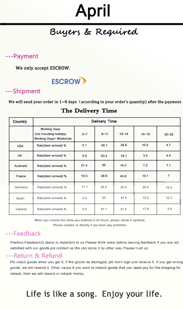 | Seller Service | On-time DeliveryIf you do not receive your purchase within 60 days, you can ask for a full refund before order completion (when you click "Confirm Order Received" or exceed confirmation timeframe). |