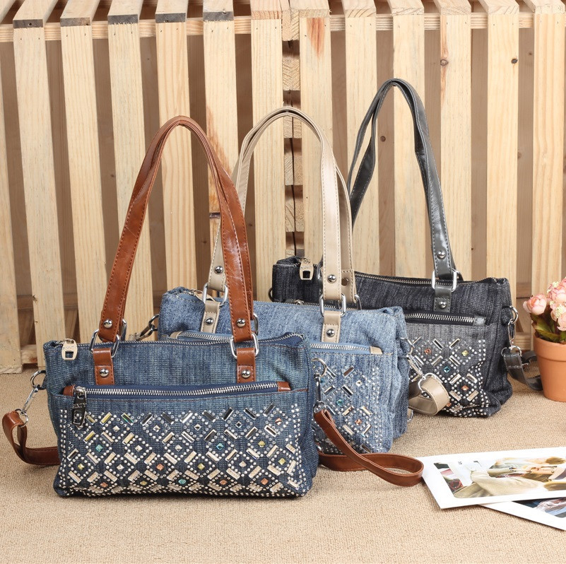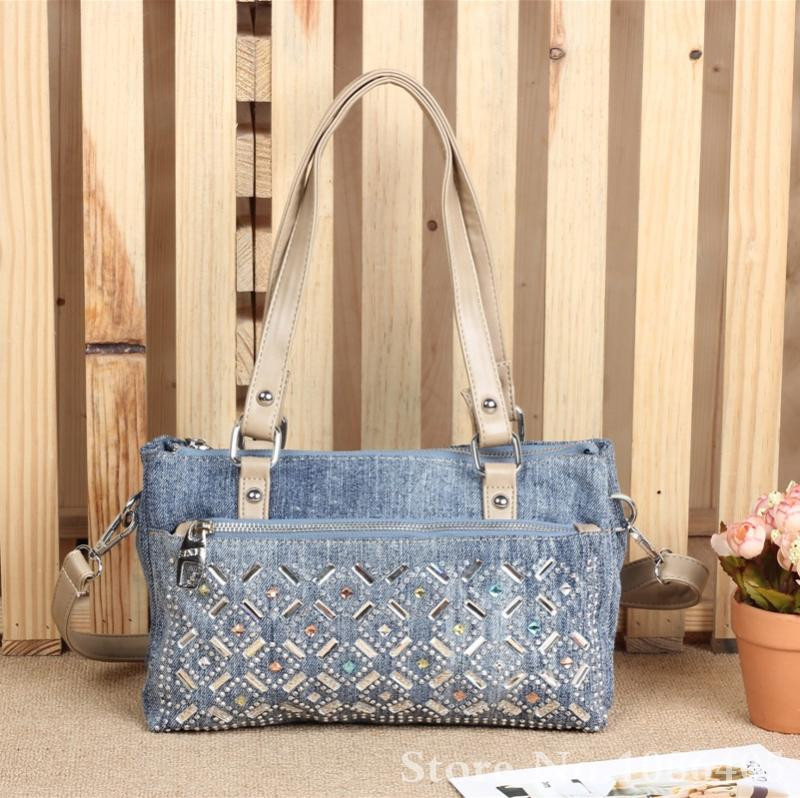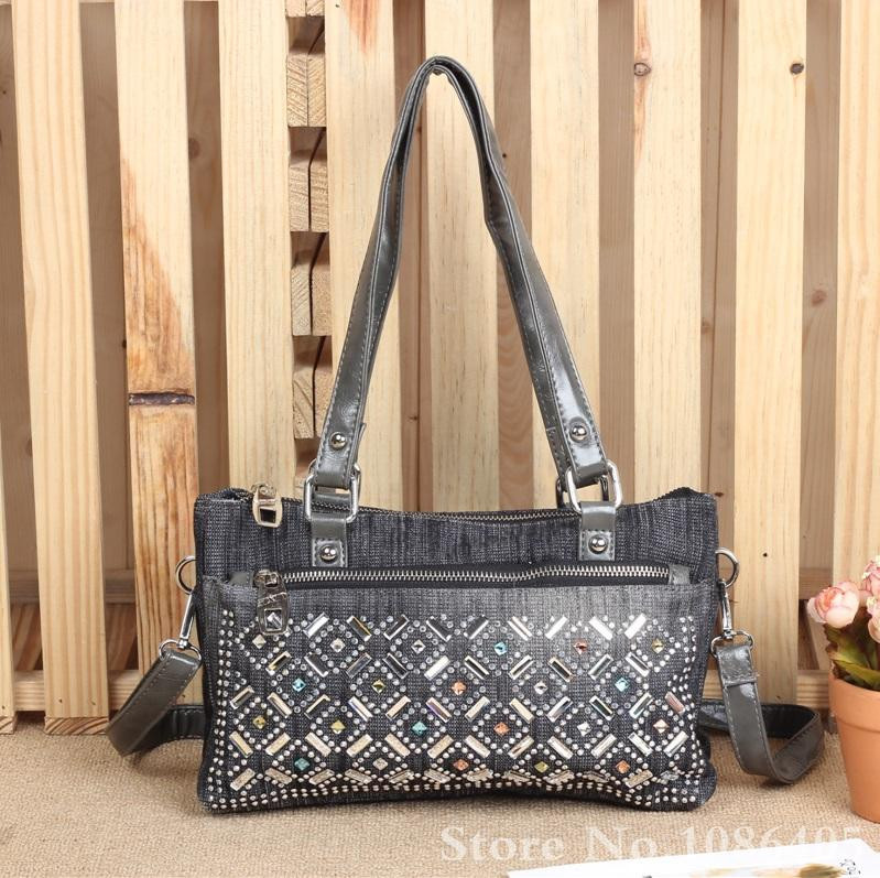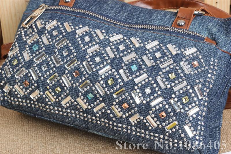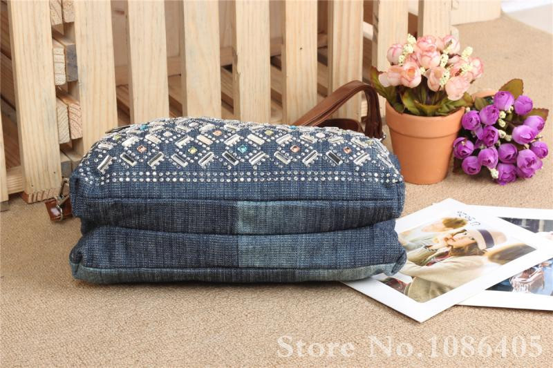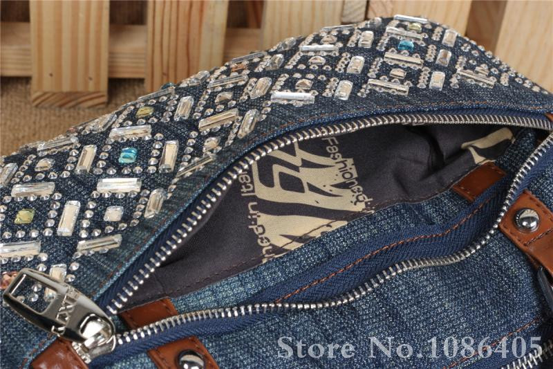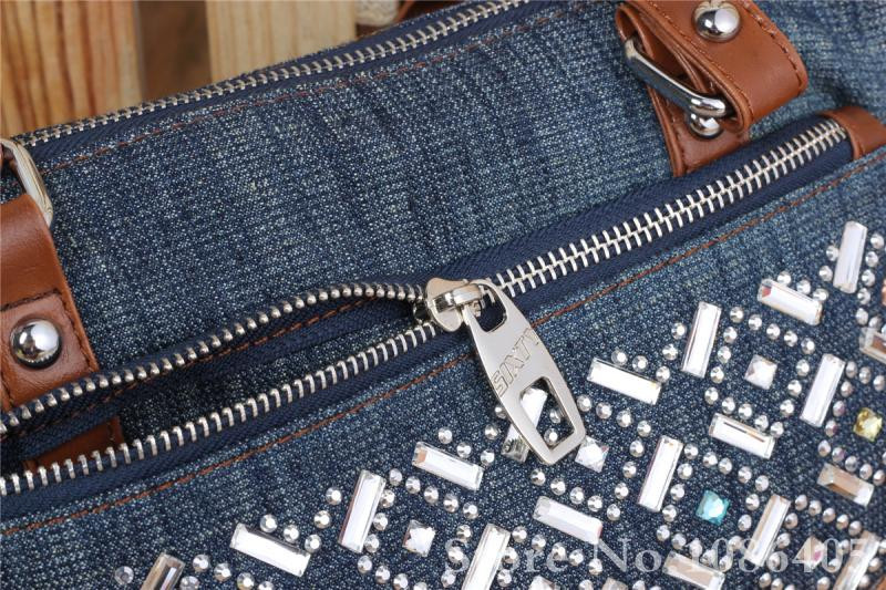 2014 New Vintage Fashion Zipper Jeans Shine Rhinestone Cotton Women HandBags Shoulder Totes For Evening Party Free Shipping