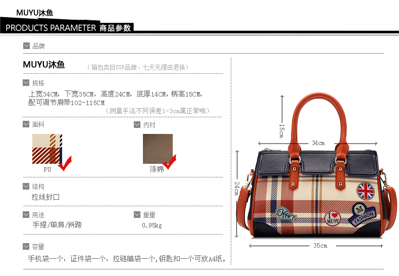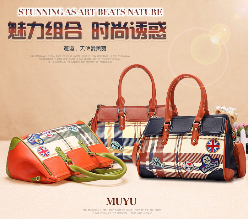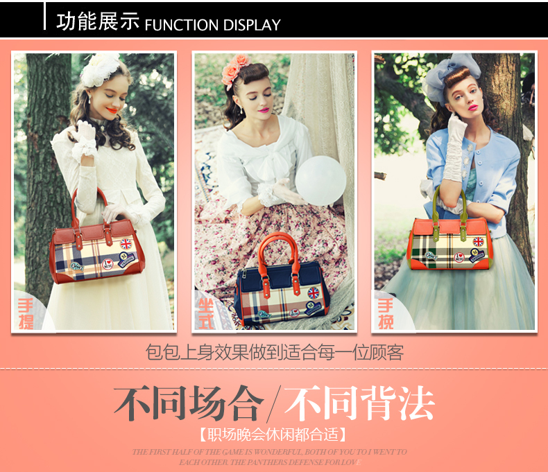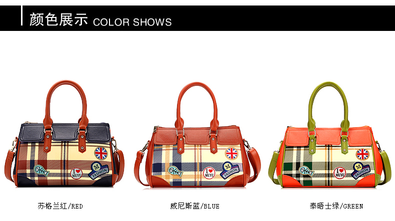 Fashions Name: Boston bag style: handbag Material: PU Material Process: soft surface types mention carry parts: the soft closed mode: zipper Internal Structure: zipper pocket cell phone pocket sandwich zipper bag document bag luggage bag type: dig bag Popular elements: lattice pattern: stripes color Category: Scottish Thames red green Blue Venice whether the sandwich: a luggage hardness: soft whether folding: No Condition: New application scenarios: Casual bag size: (the longest side 30-50cm) style : European and American fashion shape: square cross-section lining material: polyester