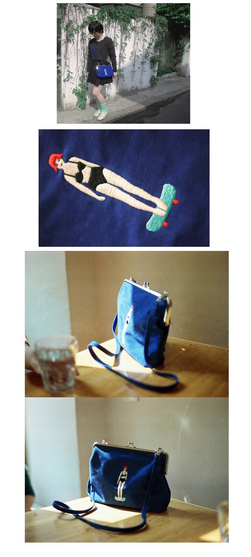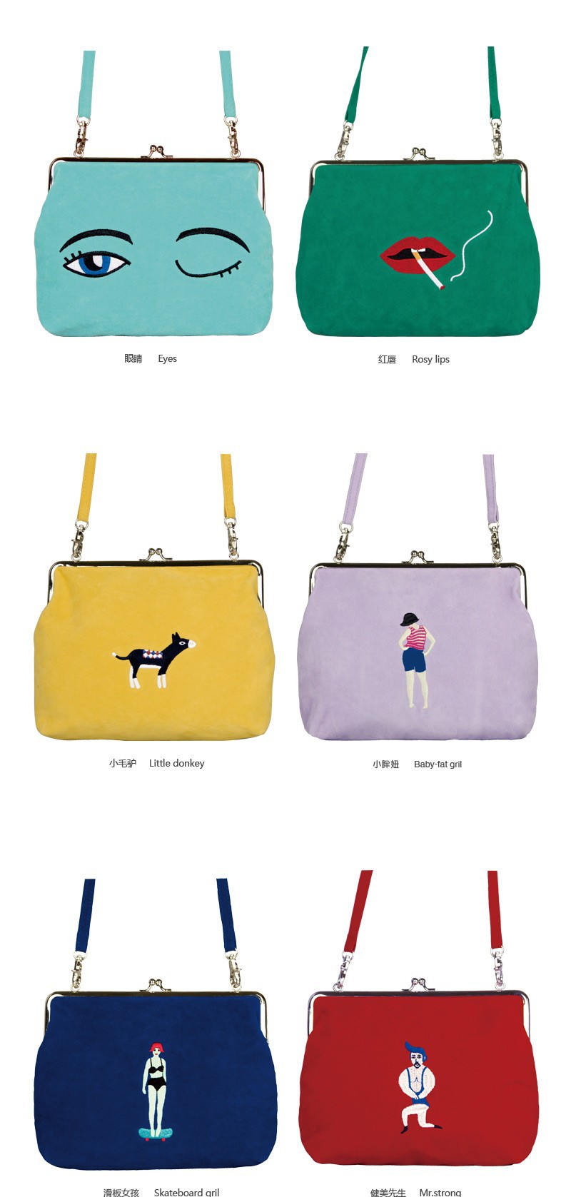 The clutch bag we have Red with Mr. strong, Blue with eye, Green with rosy lipd, Yellow with little donkey, Purple with Baby-fat girl, Dark Blue with skateboard girl.