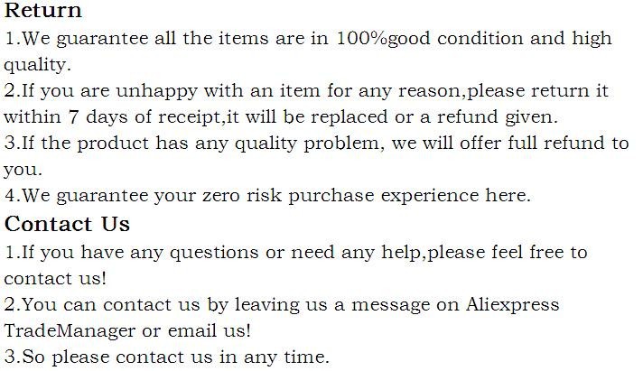 | Return Policy | If the product you receive is not as described or low quality, the seller promises that you may return it before order completion (when you click "Confirm Order Received" or exceed confirmation timeframe) and receive a full refund. The return shipping fee will be paid by you. Or, you can choose to keep the product and agree the refund amount directly with the seller. N.B.: If the seller provides the "Longer Protection" service on this product, you may ask for refund up to 15 days after order completion. |