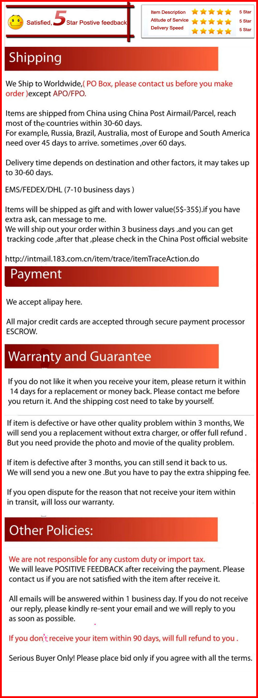 | 45 days Money back Returns accepted if product not as described, buyer pays return shipping; or keep the product & agree refund with seller. | |
