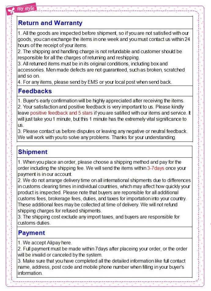| Seller Service | On-time DeliveryIf you do not receive your purchase within 60 days, you can ask for a full refund before order completion (when you click "Confirm Order Received" or exceed confirmation timeframe). |