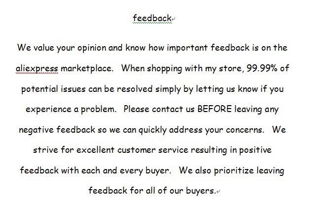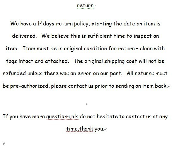 Return PolicyIf the product you receive is not as described or low quality, the seller promises that you may return it before order completion (when you click "Confirm Order Received" or exceed confirmation timeframe) and receive a full refund. The return shipping fee will be paid by you. Or, you can choose to keep the product and agree the refund amount directly with the seller.