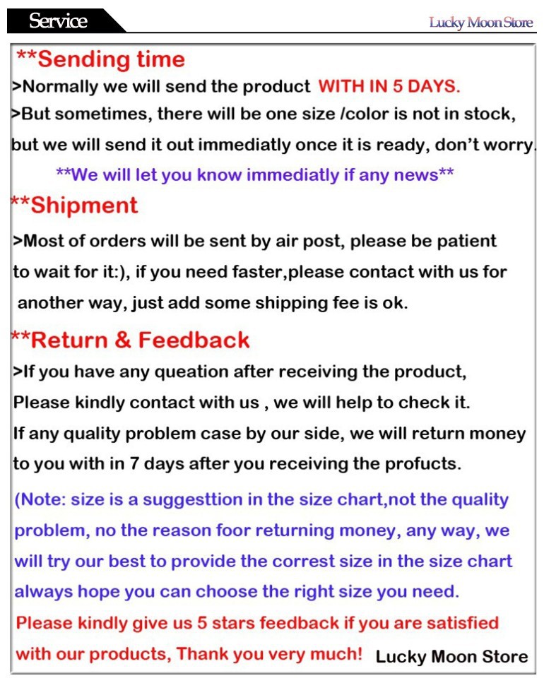 1)Most of the time, we will send out the product 3~ 5 days after payment. 2) but sometimes, there will be one size/color no have stock, we will make it as soon as possible andwill send it to you once it is ready, any news we will let you know firstly,don’t worry:) |
