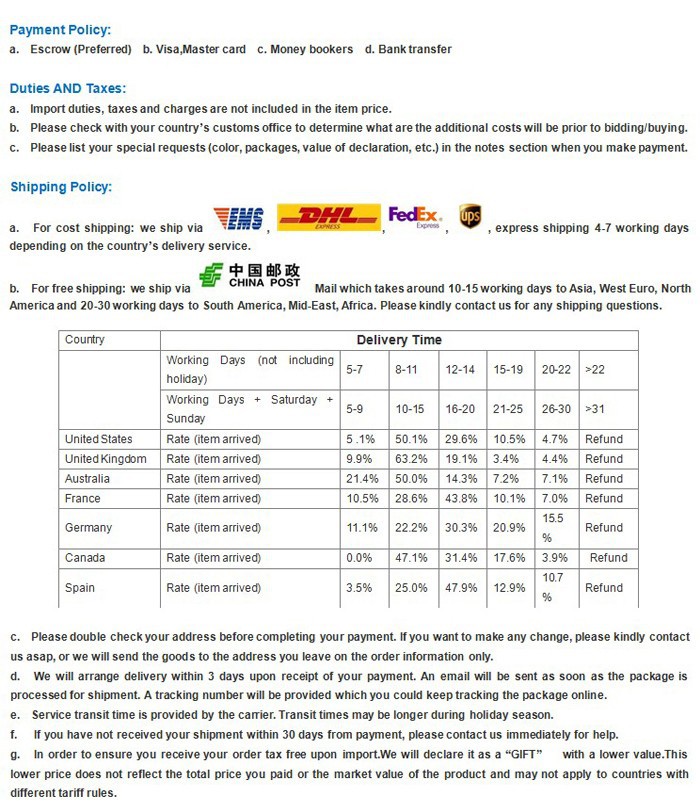 | Seller Service | On-time DeliveryIf you do not receive your purchase within 60 days, you can ask for a full refund before order completion (when you click "Confirm Order Received" or exceed confirmation timeframe). |