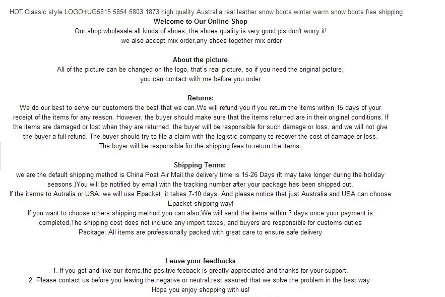 | Seller Service | On-time DeliveryIf you do not receive your purchase within 60 days, you can ask for a full refund before order completion (when you click "Confirm Order Received" or exceed confirmation timeframe). |