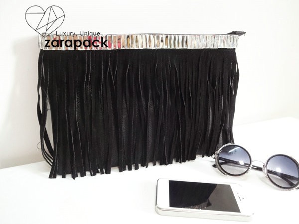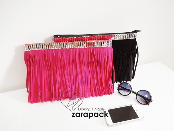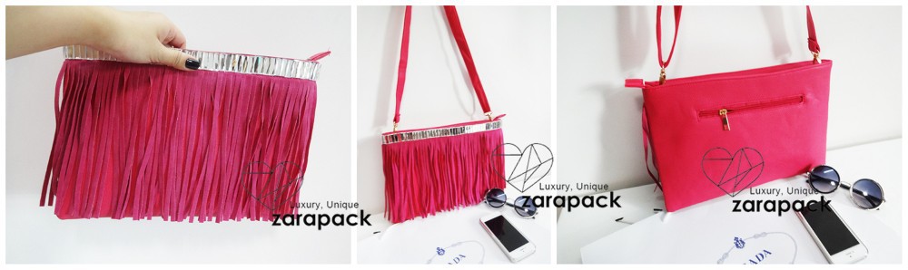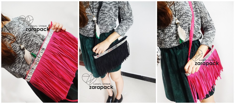 This is a very chic design bag , featured by shinning rhinestone and black or red tassel on the front, large zipper compartment, one inner zipper pouch and one zipper pouch on the back, detachable adjustable strap.