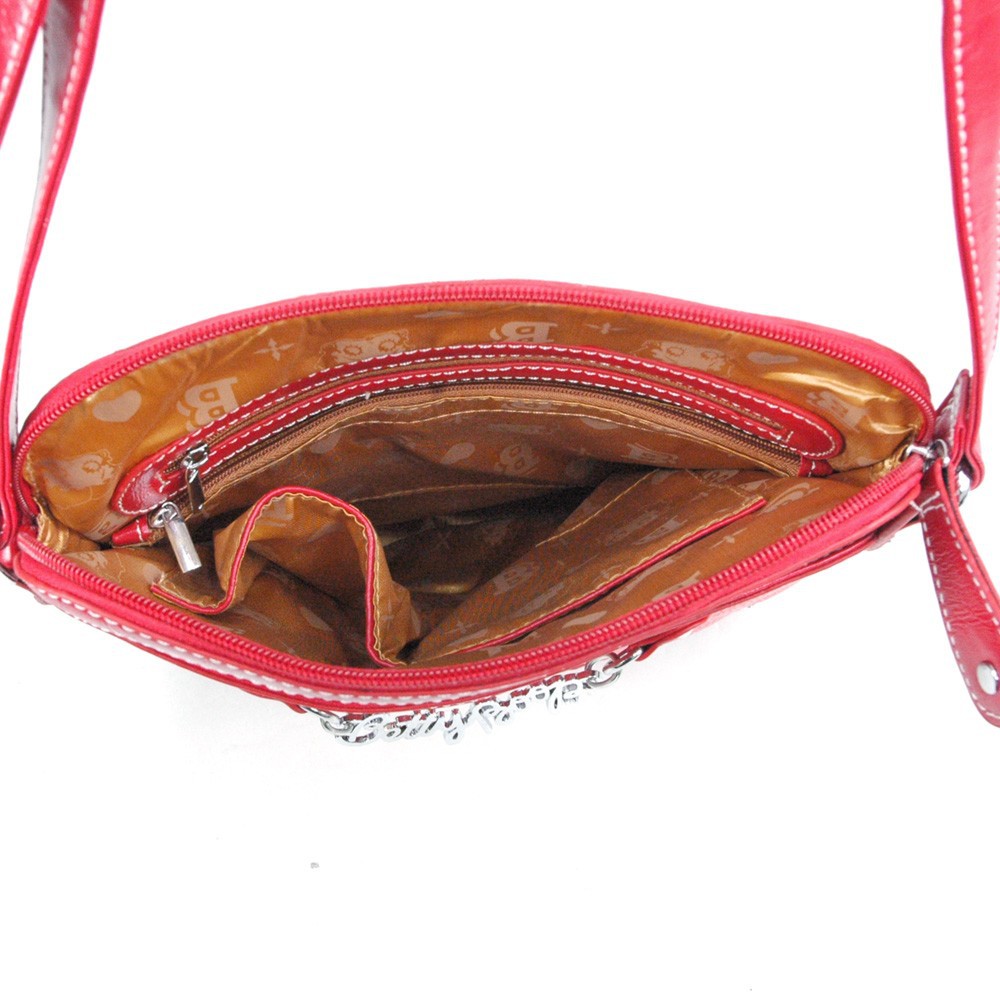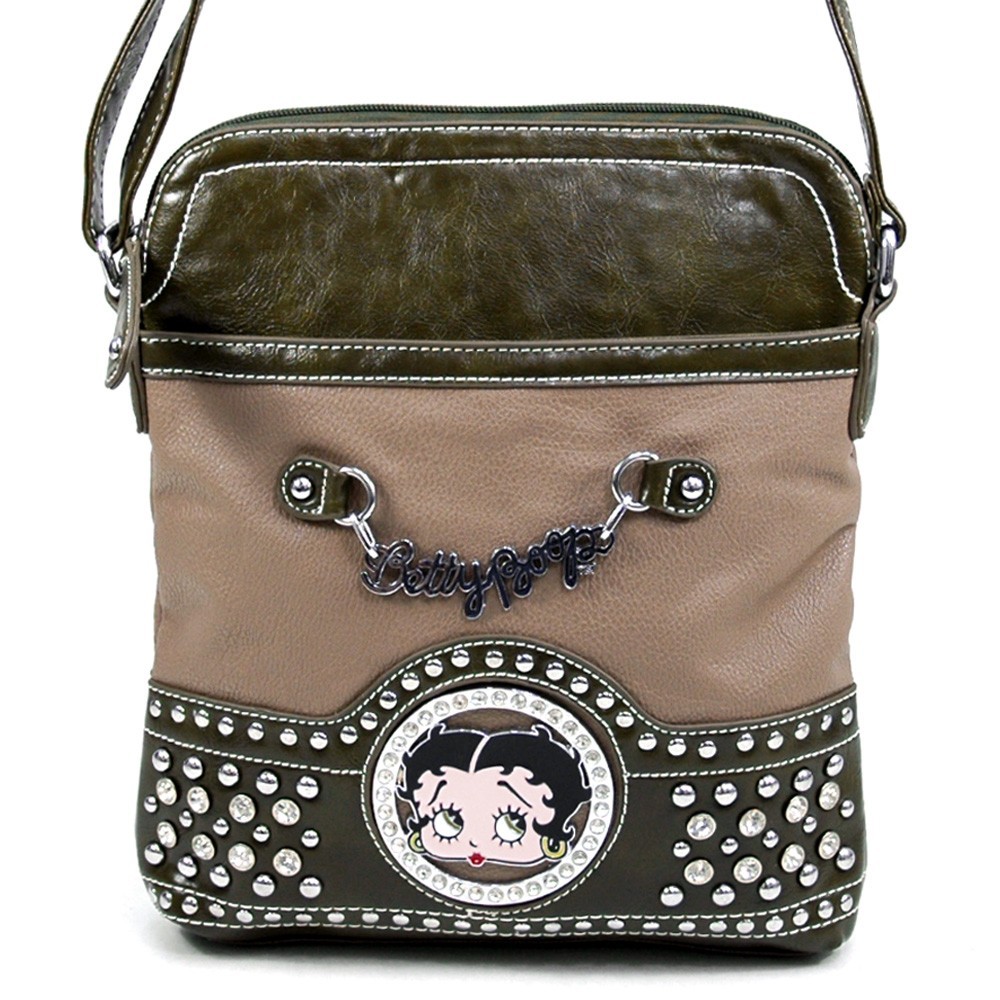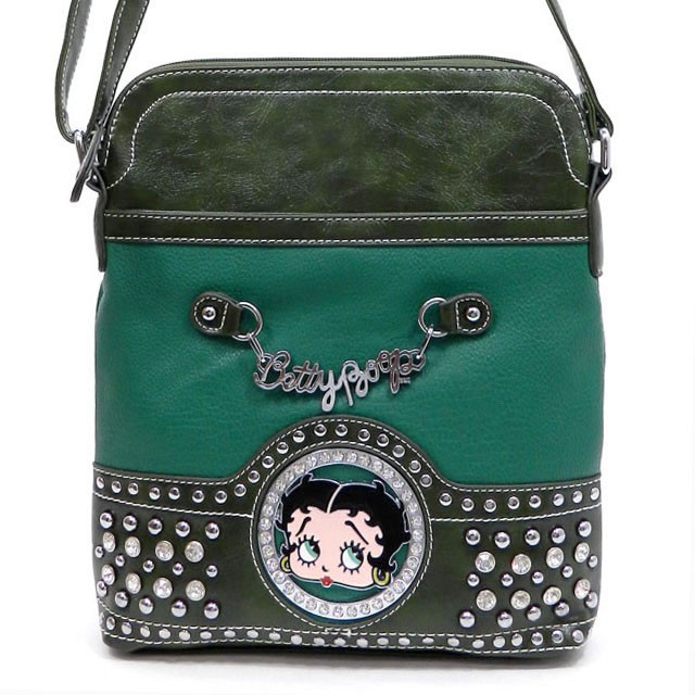Rhinestones and studs adorn this classic messenger bag with Betty Boop metal charm