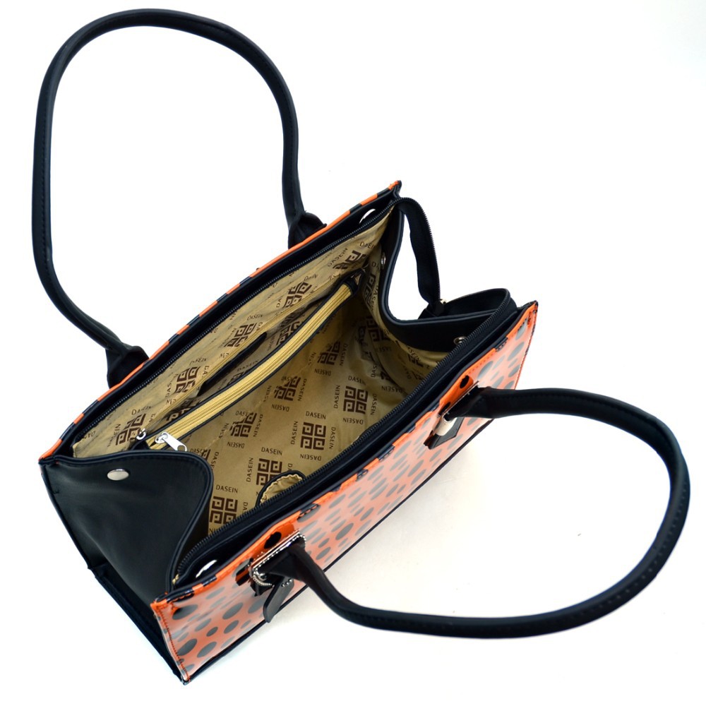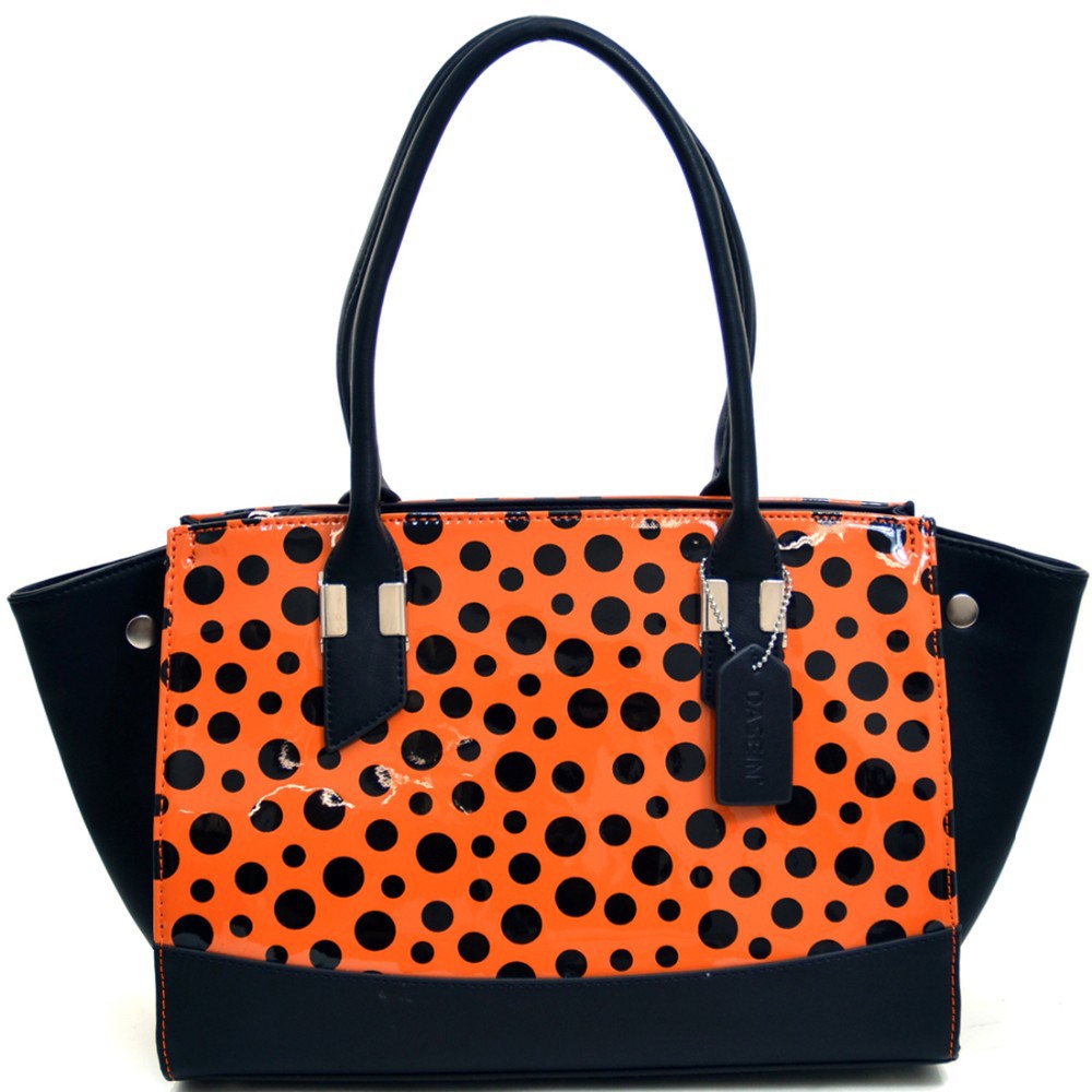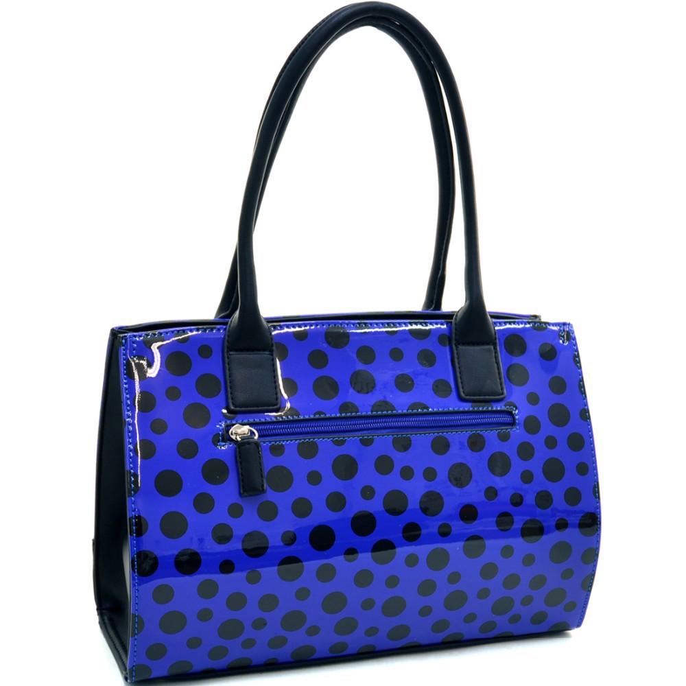 This convertible satchel by Dasein® has a few tricks in store in this bag. Its body can take the form of a little classic box shape with the zippered top closure; and when you’re looking to change things up a little bit, the push snap fixtures inside near the top allows you to pinch out the sides for a new look. Aside from its muliple looks, this satchel features a glossy and bubbly polka dot design.