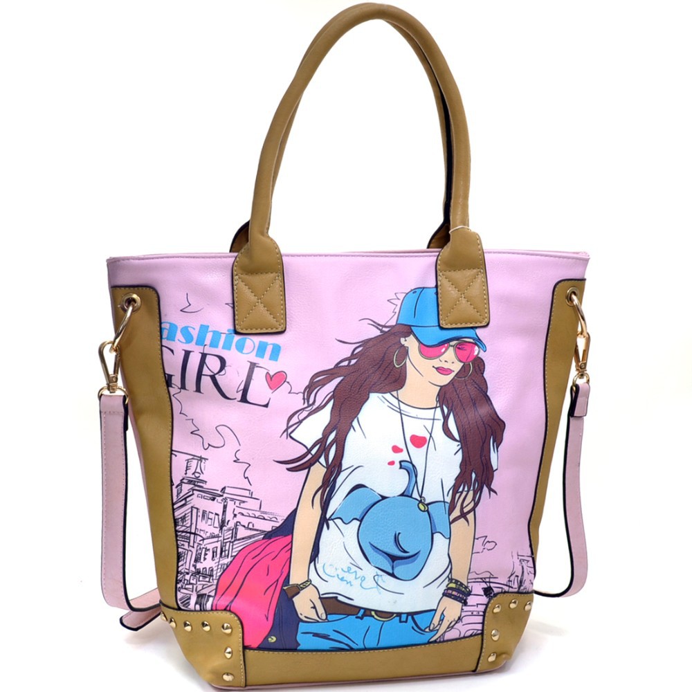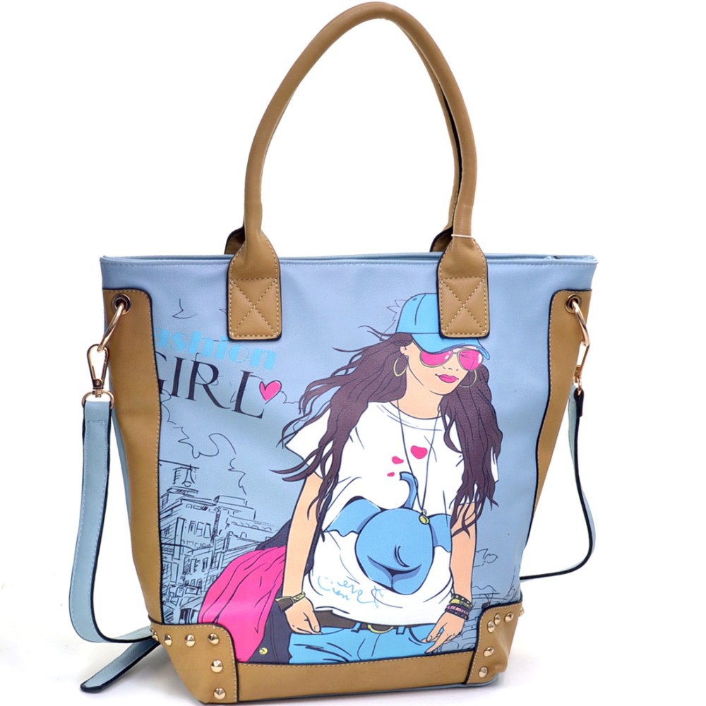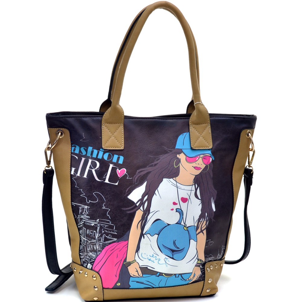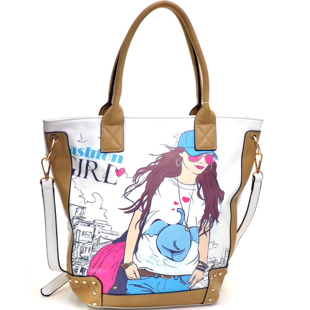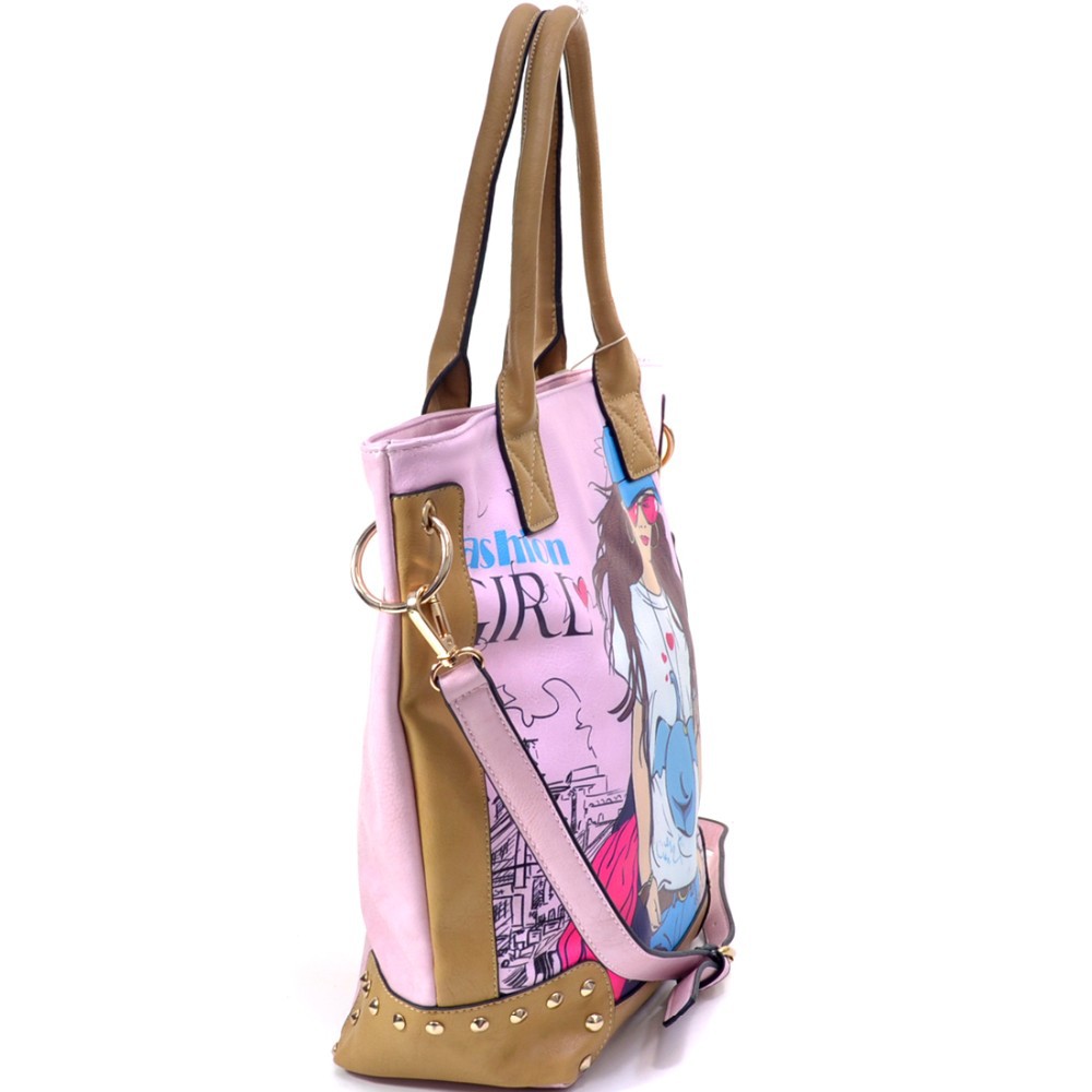 Fashion Girl Double Studded Print Removable Strap Rose Gold Accented Tote