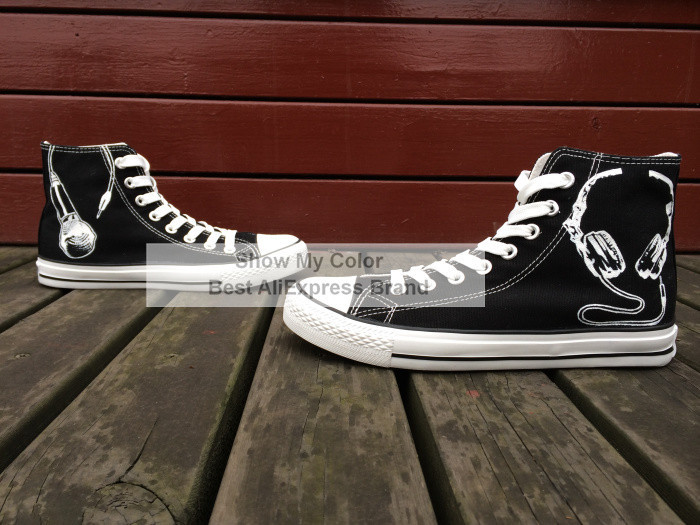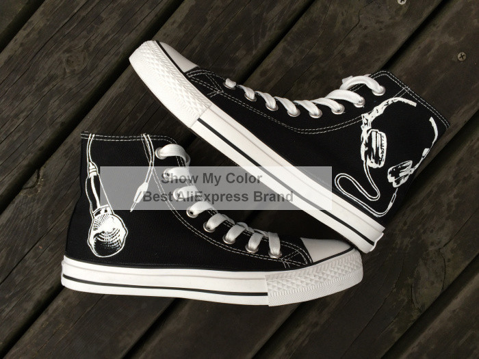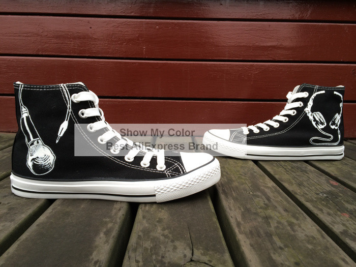 Fashion High Top Sneaker Black Microphone Earphone Sketch Hand Painted Canvas Shoes for Men Women