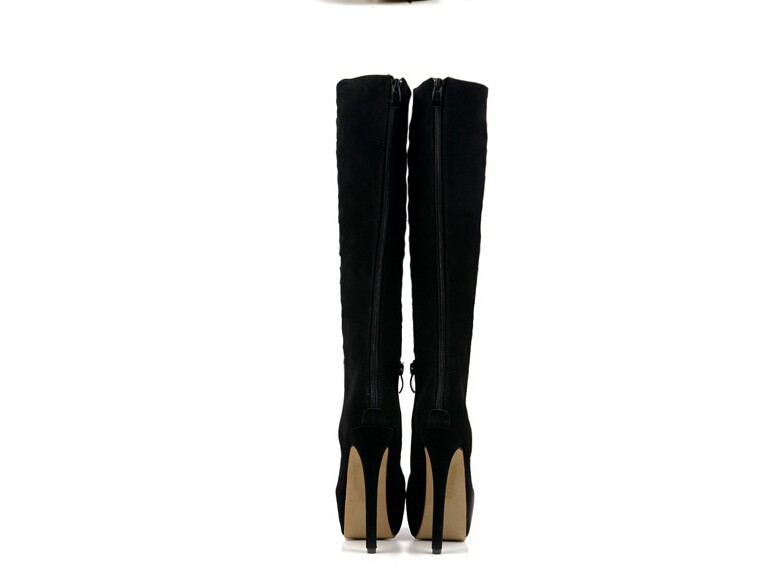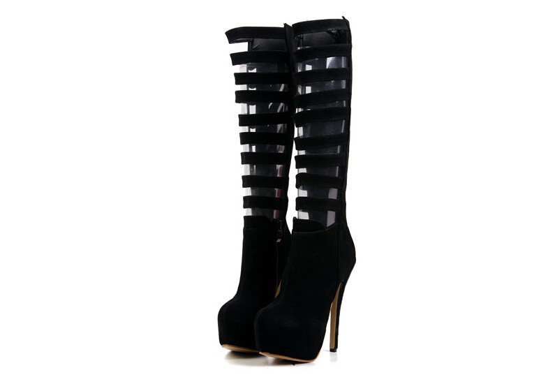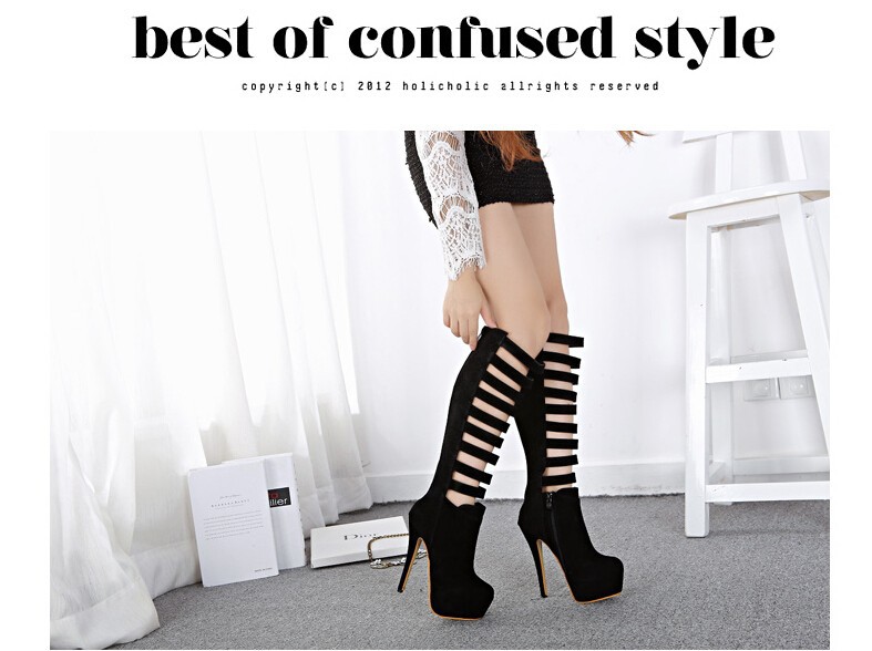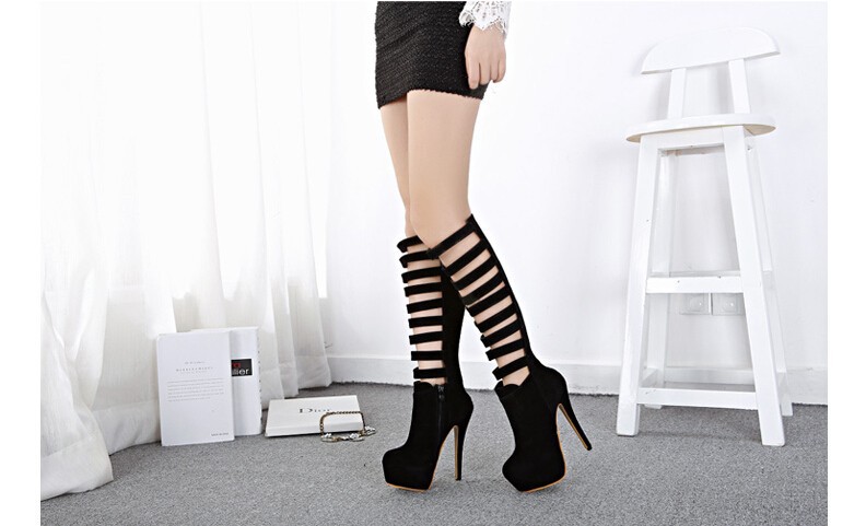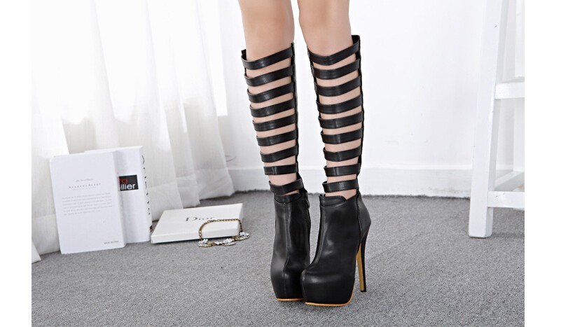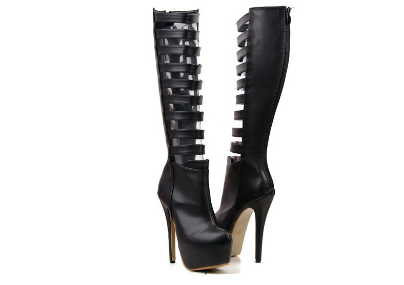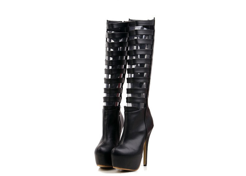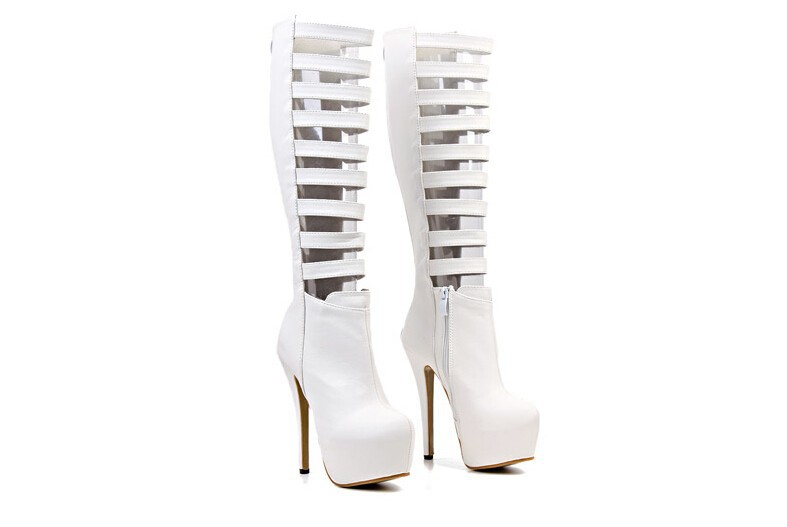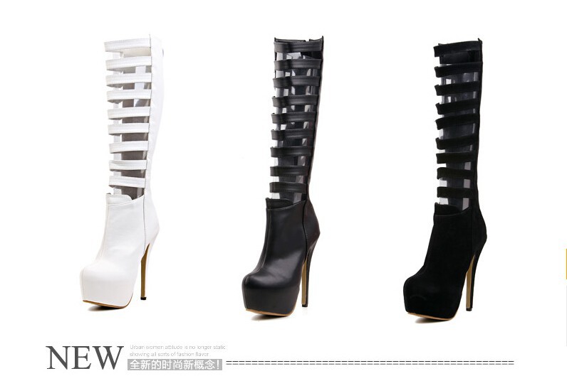 Fashion sexy women knee high boots cut out Premium leather upper zip closure stacked-style stiletto 16cm heel black white