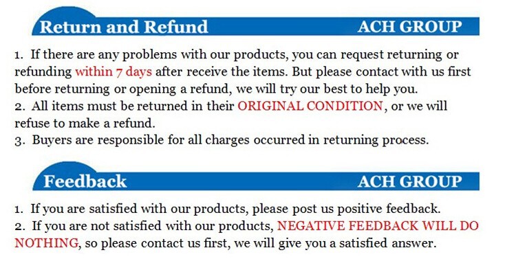 Return PolicyIf the product you receive is not as described or low quality, the seller promises that you may return it before order completion (when you click "Confirm Order Received" or exceed confirmation timeframe) and receive a full refund. The return shipping fee will be paid by you. Or, you can choose to keep the product and agree the refund amount directly with the seller.