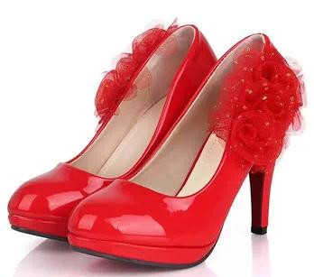 Festive red wedding with ultra- thin high-heeled waterproof leather shoes lace flowers bridal dance@01 dating