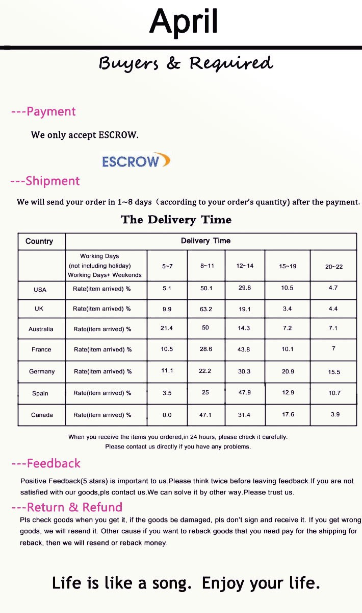 | Seller Service | On-time DeliveryIf you do not receive your purchase within 60 days, you can ask for a full refund before order completion (when you click "Confirm Order Received" or exceed confirmation timeframe). |