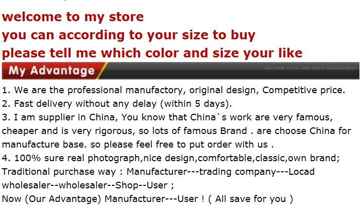 1. We ship to worldwide. 2. Import duties, taxes and charges are not included in the item price or shipping charges. These charges are the buyer’s responsibility. 3.Items will be shipped within 3 working days after we receive your payment (except weekend and holiday). 4. Shipping by China Post would be arrived within 15-25 working days according to different countries. 5. Shipping by UPS, EMS, DHL etc. would be arrived within 3-7 working days. Shipping delay & Tracking number : 1.Tracking number will be emailed to you once we have shipped your order. 2.Please provide us your full address with Telephone number and make sure your shipping address is correct and deliverable.We are not responsible for wrong or undeliverable address. If you need to change your address, please check it before you pay.thanks. 3.If you need help selecting a fast and reliable shipping company, please contact us direct and we will do our best to help. All the shoes has the box package ,make sure the goods with good condition when arrive at your place !