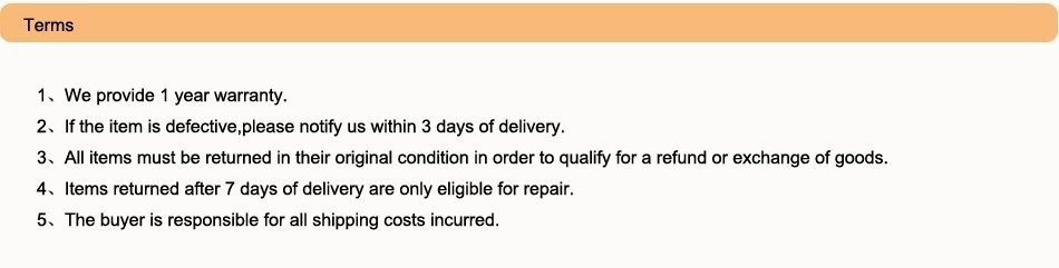 | Return Policy | If the product you receive is not as described or low quality, the seller promises that you may return it before order completion (when you click "Confirm Order Received" or exceed confirmation timeframe) and receive a full refund. The return shipping fee will be paid by you. Or, you can choose to keep the product and agree the refund amount directly with the seller. N.B.: If the seller provides the "Longer Protection" service on this product, you may ask for refund up to 15 days after order completion. |
