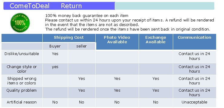 | Return Policy | If the product you receive is not as described or low quality, the seller promises that you may return it before order completion (when you click "Confirm Order Received" or exceed confirmation timeframe) and receive a full refund. The return shipping fee will be paid by you. Or, you can choose to keep the product and agree the refund amount directly with the seller. N.B.: If the seller provides the "Longer Protection" service on this product, you may ask for refund up to 15 days after order completion. |