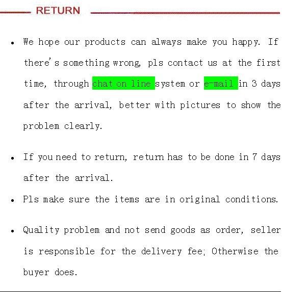 | Return Policy | If the product you receive is not as described or low quality, the seller promises that you may return it before order completion (when you click "Confirm Order Received" or exceed confirmation timeframe) and receive a full refund. The return shipping fee will be paid by you. Or, you can choose to keep the product and agree the refund amount directly with the seller. N.B.: If the seller provides the "Longer Protection" service on this product, you may ask for refund up to 15 days after order completion. |