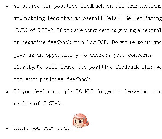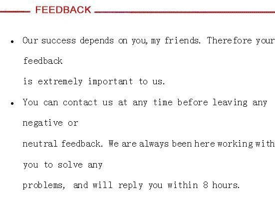 | Seller Service | On-time DeliveryIf you do not receive your purchase within 60 days, you can ask for a full refund before order completion (when you click "Confirm Order Received" or exceed confirmation timeframe). |