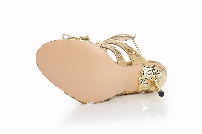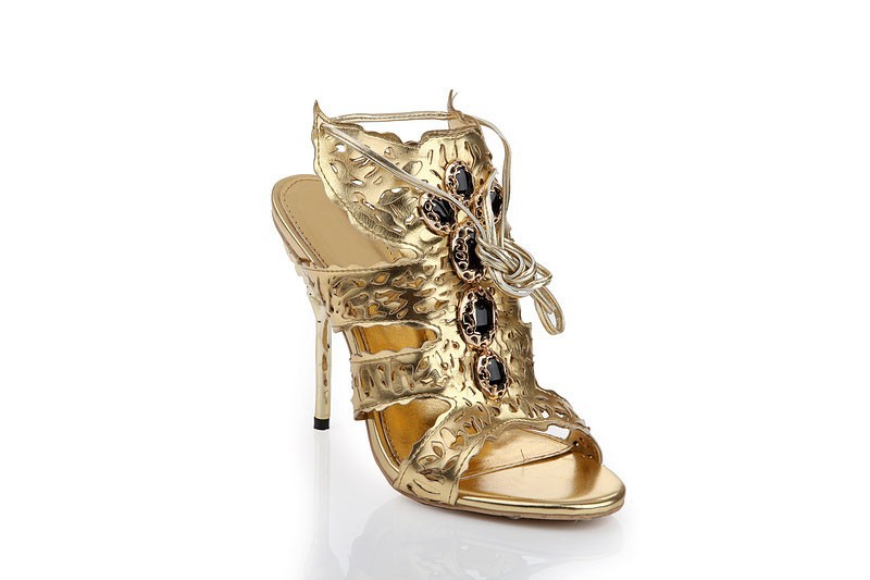 Free Shipping Women s 2014 New Fashion Gold Cut outs leather With Black Crystal Ankle Strap