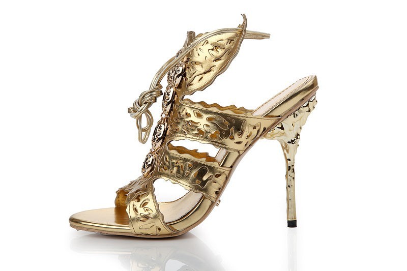 Free Shipping Women’s 2014 New Fashion Gold Cut-outs leather With Black Crystal Ankle Strap Sandals,Ladies 10cm High Heel Pumps
