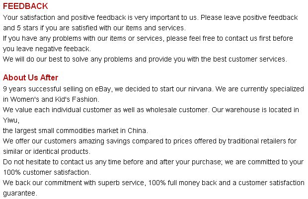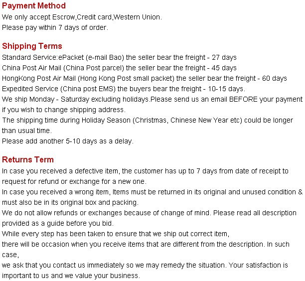 | Seller Service | On-time DeliveryIf you do not receive your purchase within 60 days, you can ask for a full refund before order completion (when you click "Confirm Order Received" or exceed confirmation timeframe). |