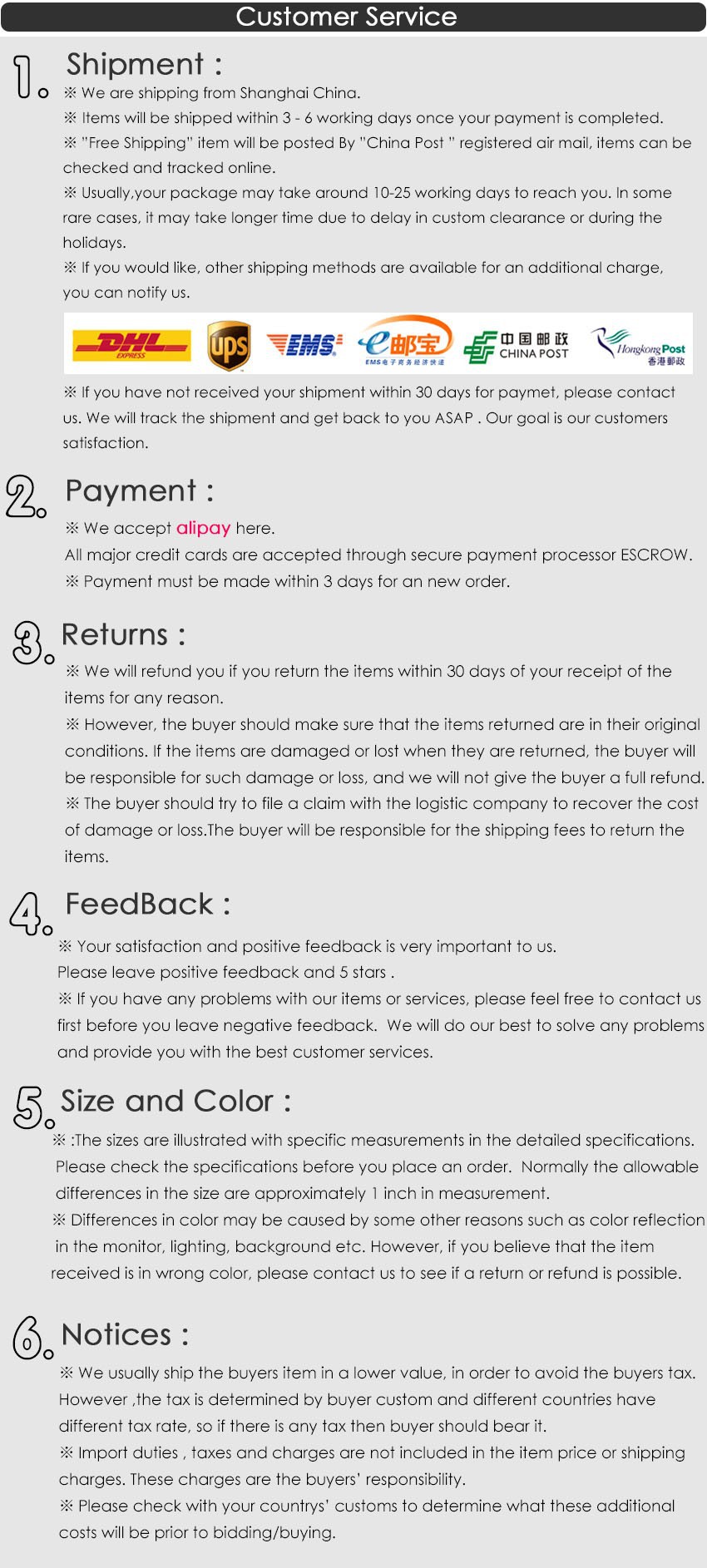 | Seller Service | On-time DeliveryIf you do not receive your purchase within 60 days, you can ask for a full refund before order completion (when you click "Confirm Order Received" or exceed confirmation timeframe). |