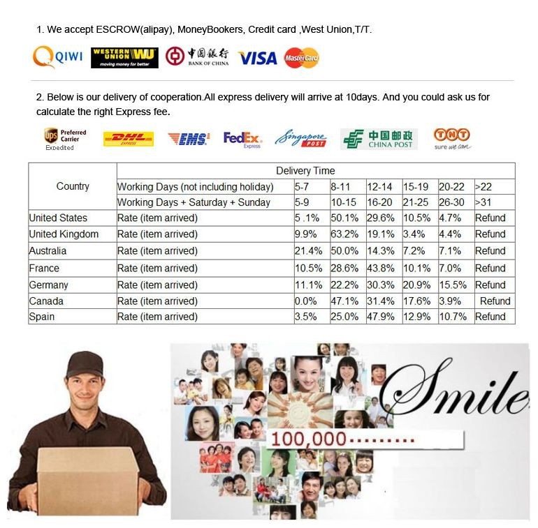 Seller ServiceOn-time DeliveryIf you do not receive your purchase within 60 days, you can ask for a full refund before order completion (when you click "Confirm Order Received" or exceed confirmation timeframe).